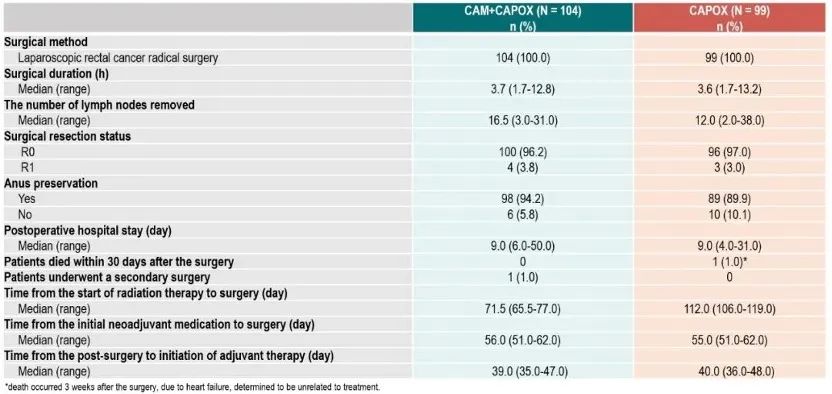 在手术人群中,CAM+CAPOX组和CAPOX组的R0切除率分别为96.2%和97.0%,保肛率分别为94.2%和89.9%(图5)。